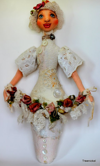 I've been busy trying ot get smaller projects finished for the fall round of craft fairs locally but it was driving me crazy seeing her hanging on my wall headless. I finally just put everything else aside and finsihed her. I'm glad I did, she really turned out nicely. I put a LOT more time into her and her details than the other two Era dolls. Her floral swag alone took almost 4 hours by the time I hand dyed the silk ribbons and then made them into flowers. Her hat took several hours too. More hand dyed silk and floral details.
